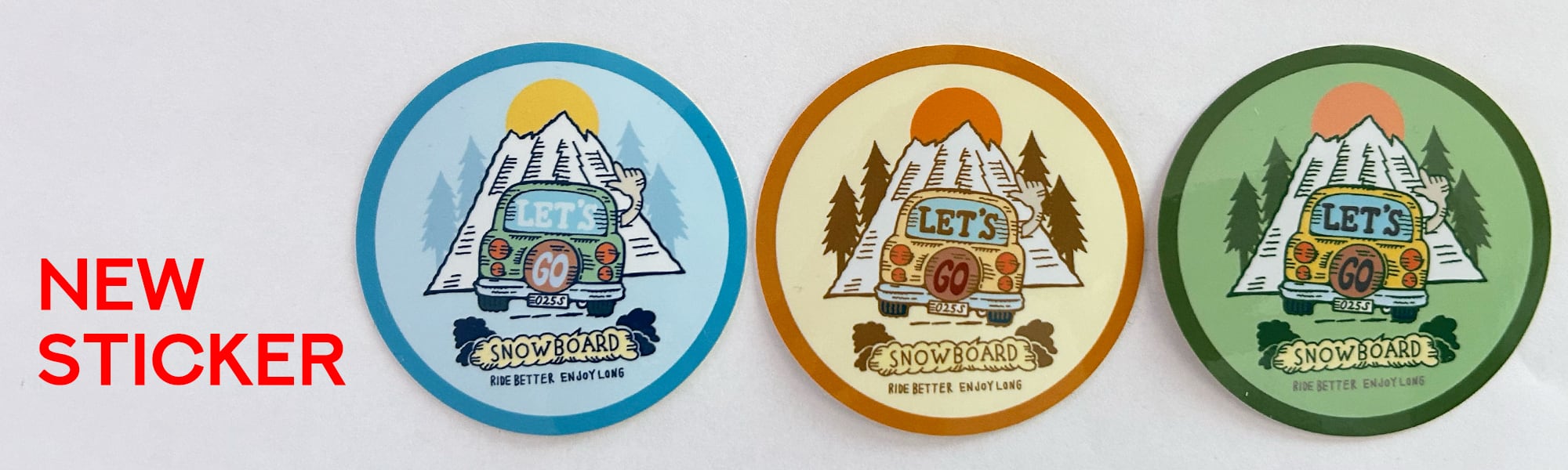 NEWデザインのベタ貼りステッカー3枚セット 直径6センチ 強粘着で耐水性が高く、スノーボードやスマホ、車に最適です デザインは 北海道・興部町でショップ「CLC」を経営するデザイナー兼プロスノーボーダー「デガラシ」こと橋本大生さんにお願いし、 レッツゴースノーボード!を象徴する「車に乗って雪山に向かう」イラストを、とってもポップに仕上げてもらいました! いつものアイテムに より愛着感を与えるのに最適です! ただいまSHOPオープン記念ステッカー・プレゼント中! 送料無料 クリックポストにてお届けいたします
